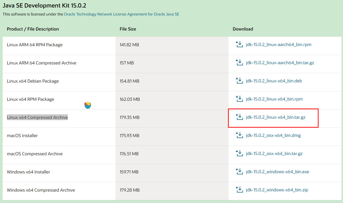 访问 JDK 的官方下载页面,选择 “Linux x64 Compressed Archive”,同意协议,下载(获得下载链接)。