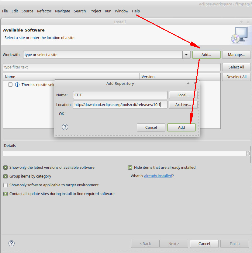 在 Eclipse 菜单中选择 help → install new software,点击 “Add…” 按钮,添加下面的软件源地址,并命名为 CDT。![添加软件源]()
