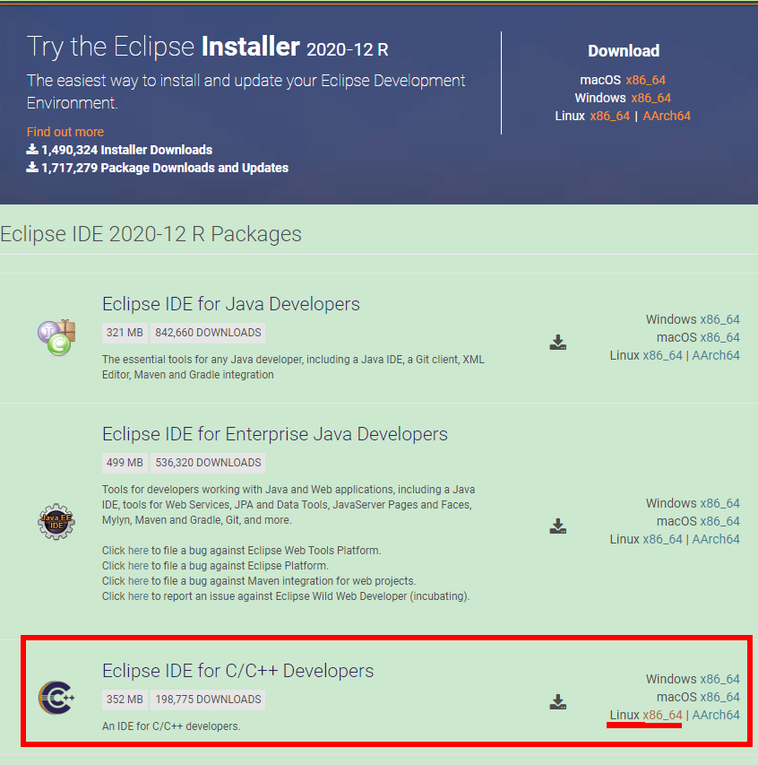 访问 Eclipse 的官方下载页面,选择 “Eclipse IDE for C/C++ Developers”,Linux 版本下载,点击进去,下载(获得下载链接)。![Eclipse的下载页面]()