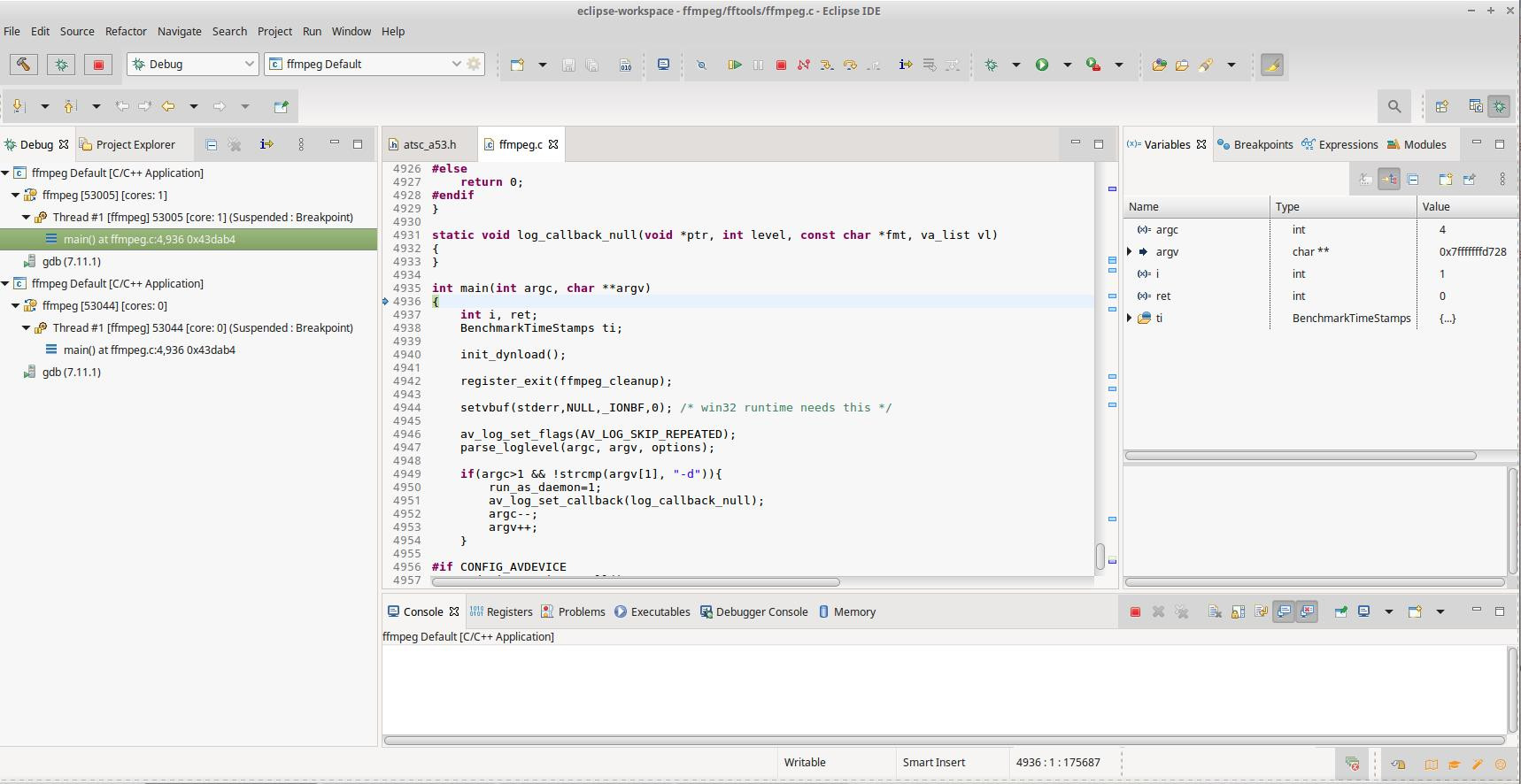 类似地,为程序添加参数:右击工程名称,Debug As →C/C+ Application(双击)→ Debug Configerations 中选择 Arguments 选项卡,选择 ffmpeg_g,在其中添加-i 01.mkv 01.mp4。